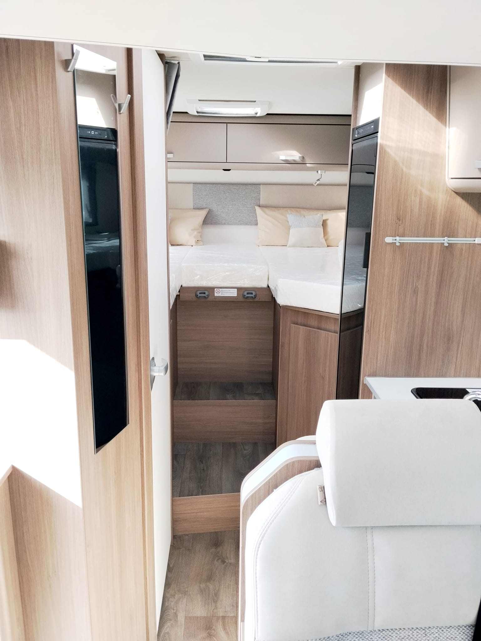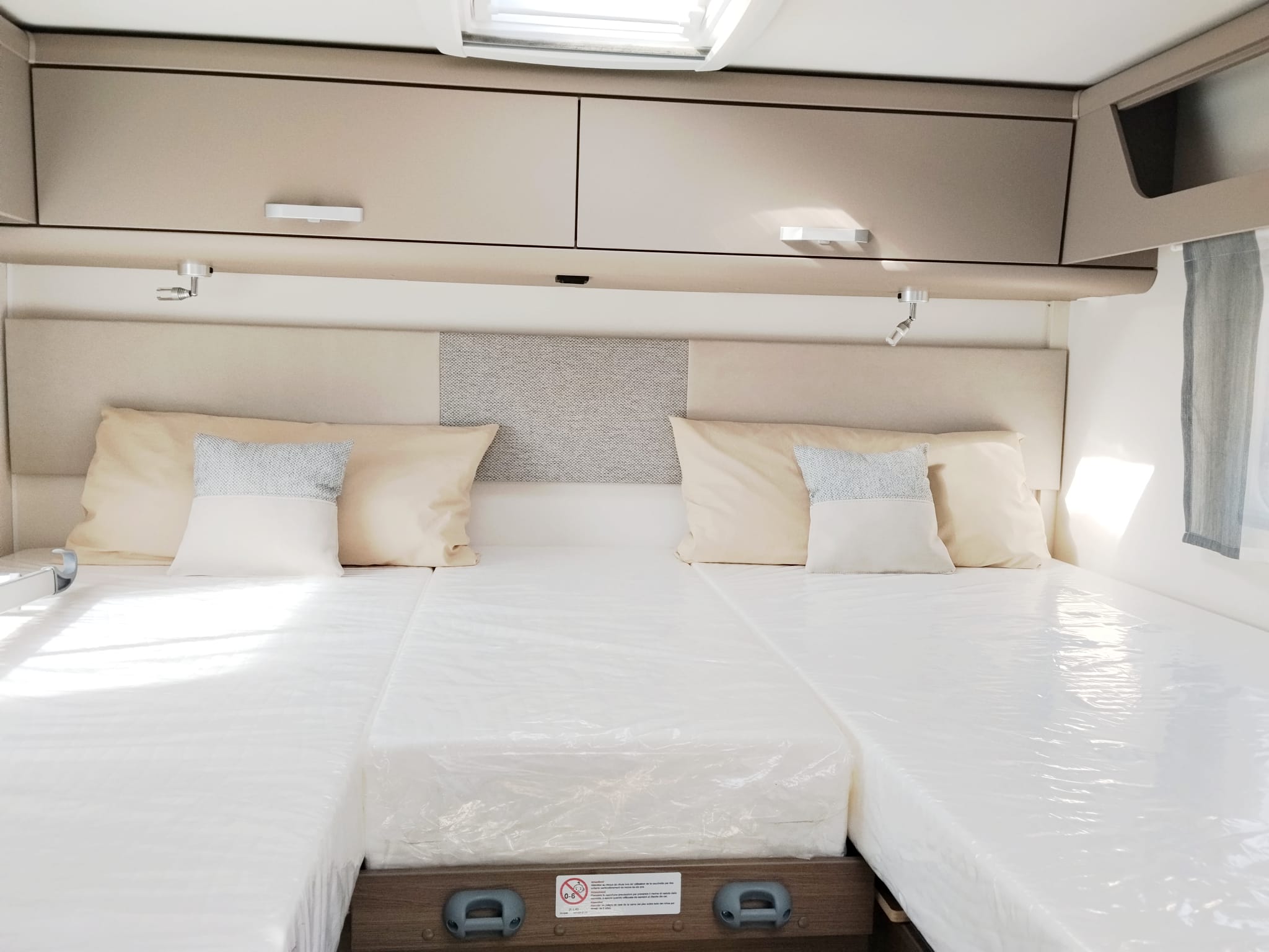 La gran ventaja de este modelo es su fiable motor Fiat Ducato 2.2 MJet de 140 CV Euro 6D con cambio automático. En su interior, presume de unas fantásticas camas gemelas traseras que se unen formando una cama gigante (210x159), una cama basculante central (195x140), una cómoda Ducha Vario con rejilla de madera, y un amplísimo garaje para tus bicicletas y equipaje.