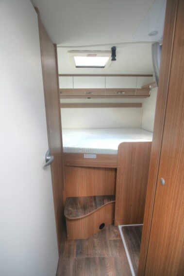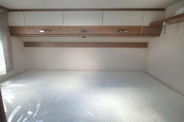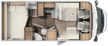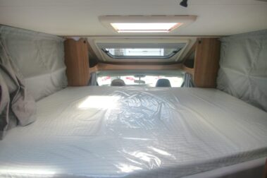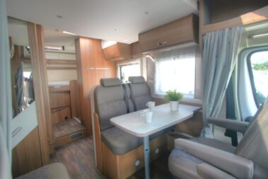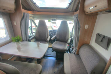 El salón es muy amplio. Dispone de un salón de dos plazas enfrente de la mesa, un sofá al lado para una persona, y los asientos de la cabina se giran para completar el salón. Tiene mucha luminosidad debido a la gran claraboya panorámica que dispone en el techo. Este modelo dispone de una cama doble siempre hecha en la parte trasera, y una cama abatible también siempre hecha que sale encima del salón.