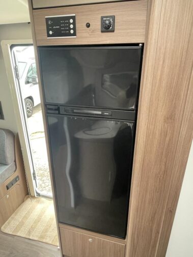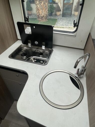Su cocina, también con disposición en L, dispone de hasta tres fuegos de gas y fregadero, además de mucho espacio de almacenamiento superior e inferior para nuestro menaje o despensa de alimentos. Dispone además de una nevera con congelador que puede ser alimentada por gas, 220v o 12V.