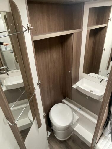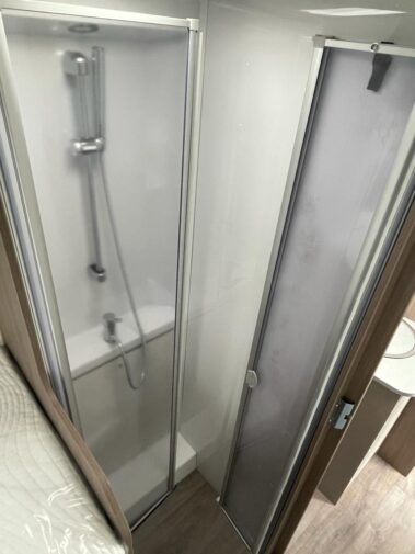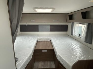 Su parte trasera destaca por sus camas gemelas, que podremos unir para crear una gran cama de matrimonio y su amplio baño, en el que tenemos separada la zona de ducha en una amplia cabina independiente frente de la cama.